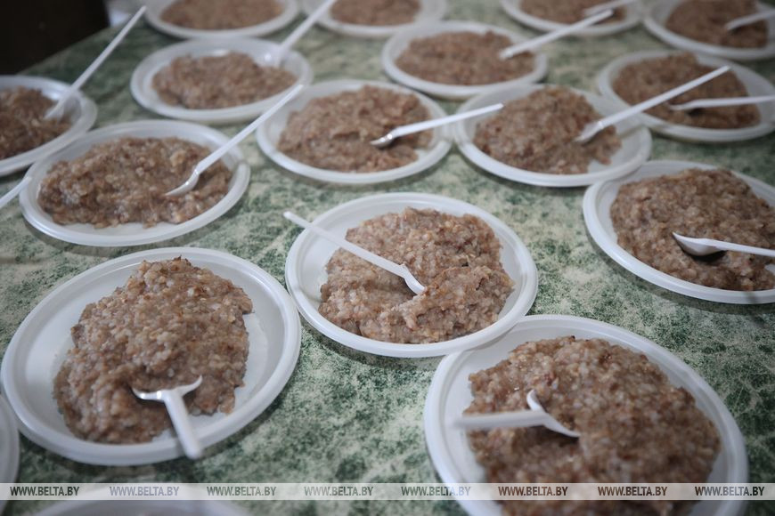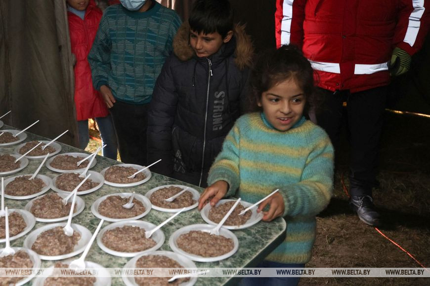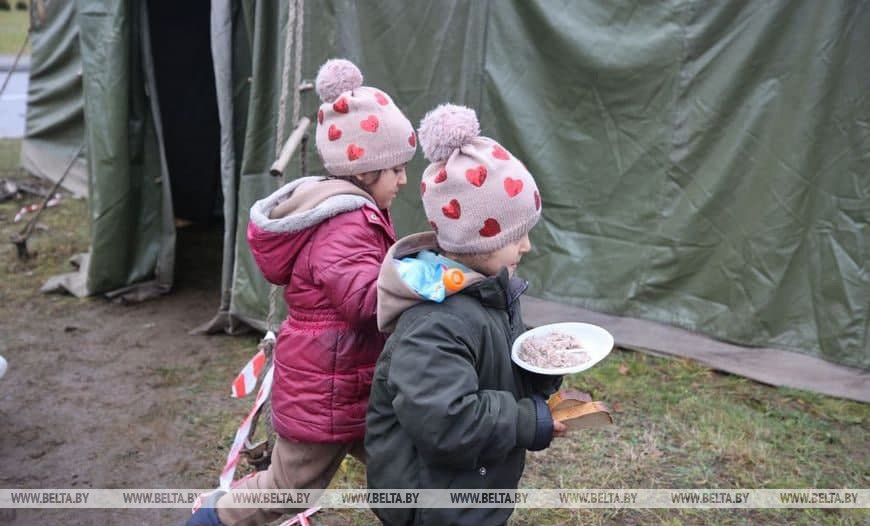 19 ноября, Гродненская область /Корр. БЕЛТА/. Беженцы, которые находятся в центре временного размещения в ТЛЦ, помимо сухого пайка, ежедневно получают горячее питание. Сегодня на обед от военных – гречневая каша с тушенкой.