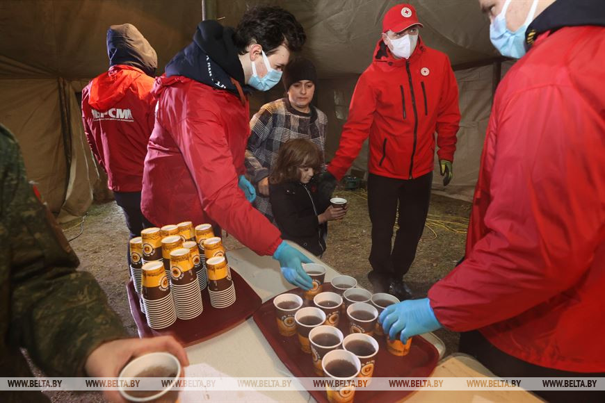 20 ноября, Гродненская область /Корр. БЕЛТА/. В ТЛЦ беженцы начали получать завтрак, в одной палатке раздают еду и горячий чай женщинам и детям, во второй - мужчинам.