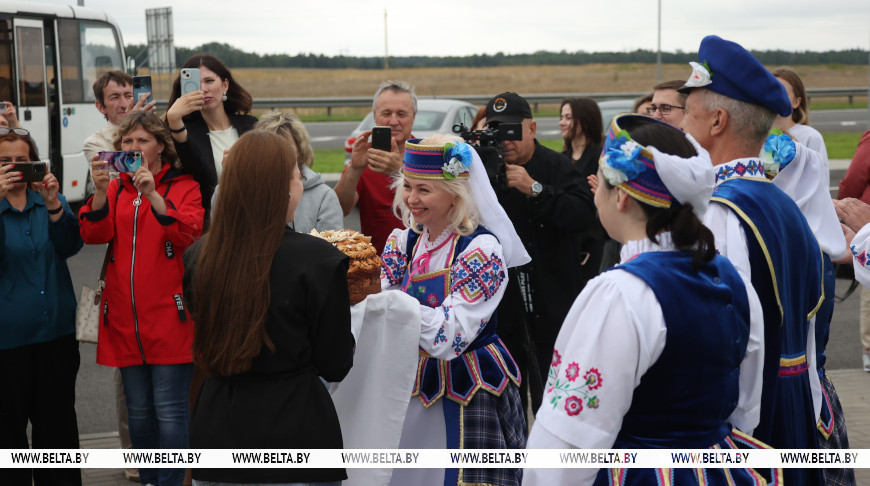 Гостей встретили на въезде в Брестскую область по трассе М1 у скульптуры 28-метрового зубра - в знак гостеприимства по старинной белорусской традиции с караваем, хлебом-солью. Металлический арт-объект несколько лет назад отреставрировали - фигуру обработали от коррозии и стильно покрасили.