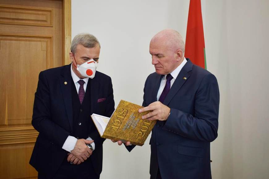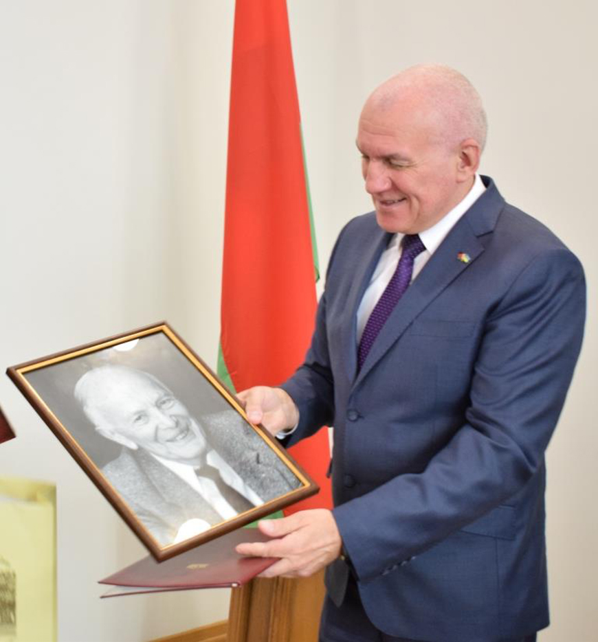 Украинский ученый передал благодарственное послание в адрес председателя Президиума Национальной академии наук Беларуси Владимира Гусакова, а также памятный фотопортрет многолетнего президента Национальной академии наук Украины, создателя и президента Международной ассоциации академий наук Бориса Патона, ушедшего из жизни в прошлом году.-0-