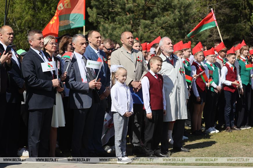В церемонии открытия композиции "Сцяг Радзiмы" приняли участие представители Миноблисполкома, Дзержинского райисполкома, военного комиссариата Минской области, БРСМ, БРПО, других общественных организаций и ведомств, делегации регионов, молодежь, авторы идеи установки памятного знака.