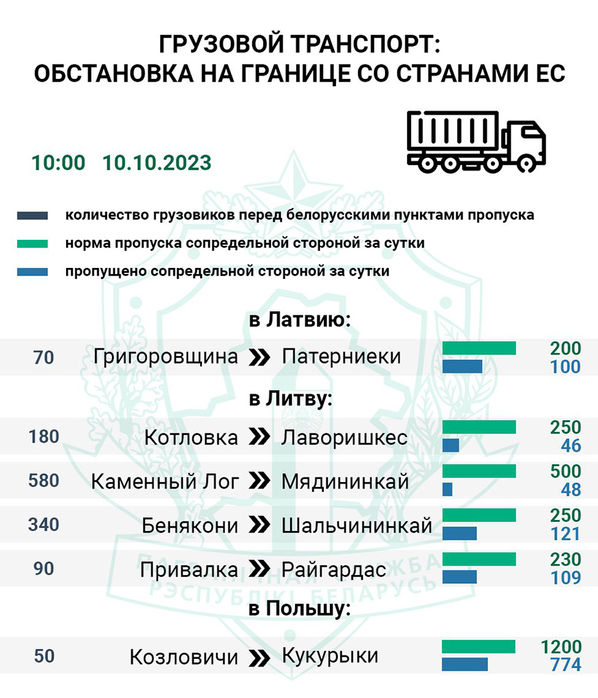 С 4 по 10 октября очередь фур перед всеми литовскими пограничными переходами увеличилась с 730 до 1275 автомобилей. По сравнению с показателями недельной давности на самом загруженном маршруте в ЕС, который проходит через литовский "Мядининкай" (сопредельный "Каменный Лог"), среднесуточное выполнение нормы пропуска грузовиков снизилось с 25% до 15%.