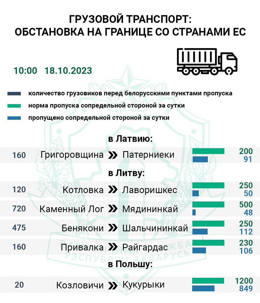 Через латвийский пункт пропуска "Патерниеки" (сопредельный "Григоровщина") в ЕС проследовали 45% фур от нормы. Через польский пограничный переход "Кукурыки" ("Козловичи") в ЕС въехали 70% грузовиков от нормы.
