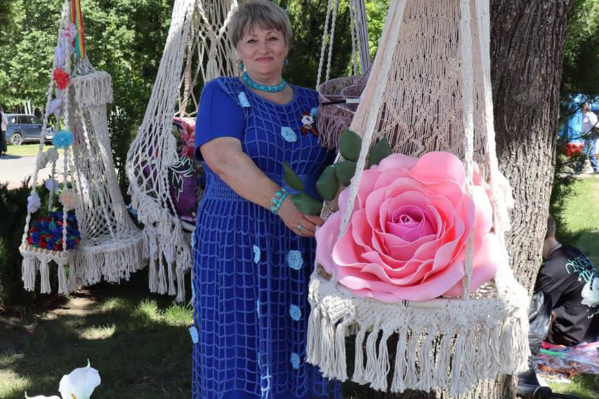 Татьяне Ефремовой на днях исполнится 73 года. Всю жизнь она работала: фельдшером-лаборантом в детской больнице, в канцелярии Министерства промышленного строительства, оператором на Заводе эффективных промышленных конструкций, после выхода на пенсию - в службе охраны. Потом переехала с супругом в Осиповичи, купила дачу неподалеку. Сейчас Татьяна Ильинична занимается ремесленничеством: плетет изделия из бисера, пишет картины, вяжет туники и накидки, делает макраме, качели, светильники. Одно время вместе с мужем даже вырезала из газосиликатных блоков садовые скульптуры - русалок и мишек.