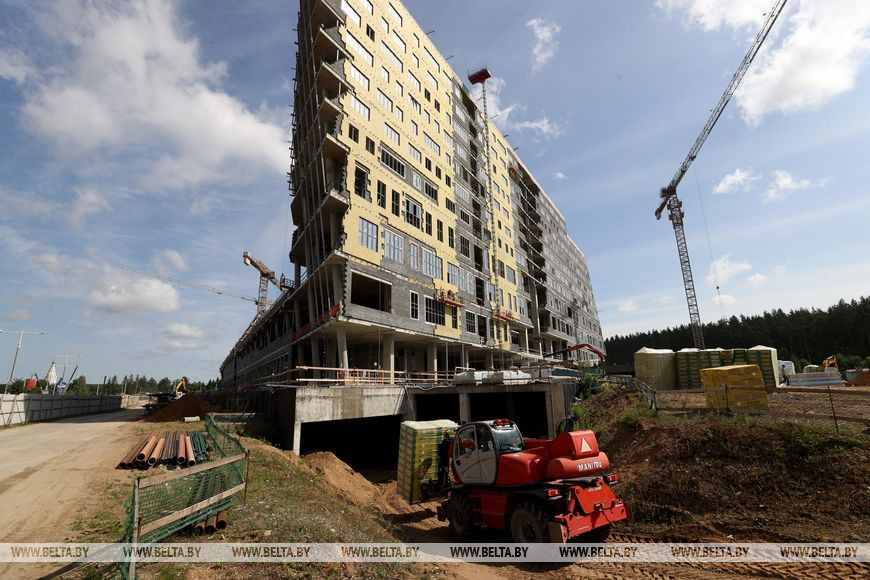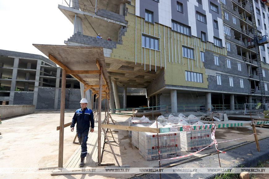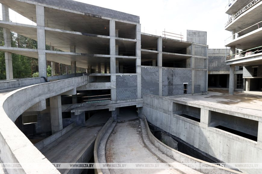 Это долгострой. "История этого объекта началась еще в 2007-2008 годах - на этапе переговоров, - пояснил первый замглавы. - Приблизительно на площадку начали заходить с 2010 года. Иностранная организация, которая находилась на этой площадке, построила весь каркас, было сделано остекление. Приблизительно с 2013-2014 года стройка была полностью заморожена. 8 лет она стояла без движения. Насколько мы понимаем, у заказчика были проблемы с финансированием. Поэтому мы были вынуждены принять меры, чтобы долгострой все-таки достроить и ввести. Изначально планировалось, что это будет апарт-отель и торговые помещения. В процессе нам пришлось перепроектироваться. В итоге будут две башни по 11 этажей, торговый центр занимает три этажа. Каждый этаж будет разделен между областями и городом Минском. Практически здесь будут представлены все предприятия Республики Беларусь. Плюс примыкает паркинг".