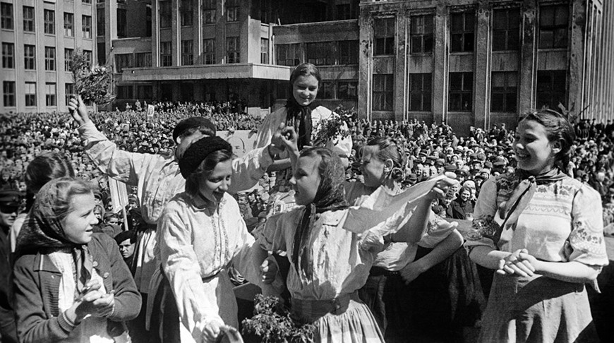 В День Победы 1945-го в Минске на грандиозный митинг у Дома правительства собрались чуть ли не все жители города - около 70 тысяч человек. В 8 утра они узнали из листовок, сброшенных самолетом из Москвы, что Германия наконец-то капитулировала. Через полчаса эта новость прозвучала в репродукторах. Люди на улицах на радостях обнимали друг друга. Город ликовал!