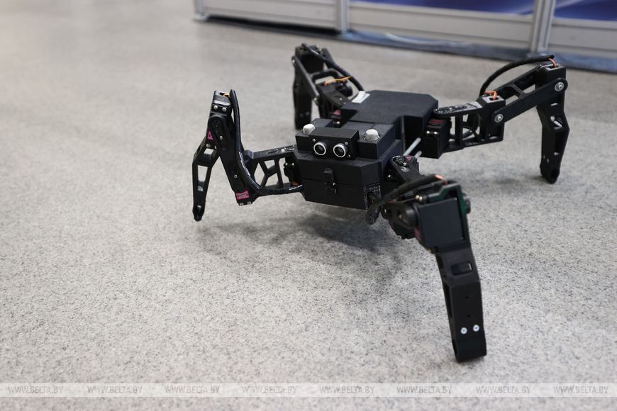 Кроме того, на стенде продемонстрирован программно-мобильный комплекс "Робот-паук", предназначенный для осуществления контроля окружающей среды. "В частности, робот-паук следит за наличием вредных газов путем установки в конструкцию специальных датчиков и разработки программного обеспечения", - добавила заместитель председателя ГКНТ. Разработан данный робот Полоцким государственным университетом им. Евфросинии Полоцкой.