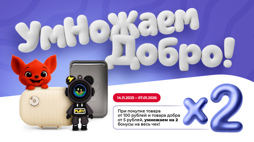 Приобретайте любой товар* из линейки "Дай пять добру!" вместе со своими технологичными покупками (в магазине или на сайте) на сумму от 100 рублей, и "5 элемент" начислит УДВОЕННЫЕ БОНУСЫ НА ВЕСЬ ЧЕК! А удвоенные бонусы вы сможете использовать как увеличенную скидку. Такой способ "5 элемент" выбрал, чтобы сказать "спасибо" за вашу доброту.