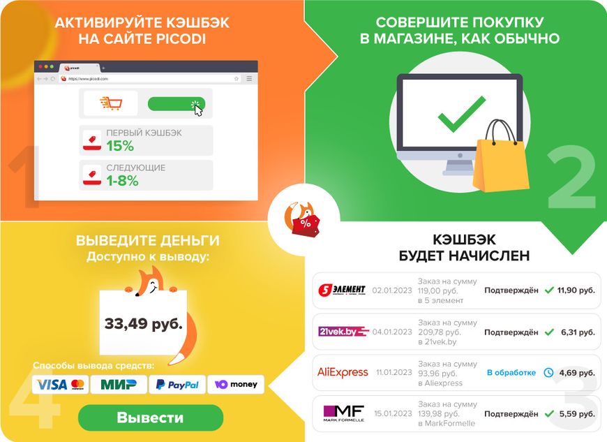 Механизм работы сайта прост: Picodi получает от магазинов комиссию за привлечение новых клиентов и делится ею со своими пользователями, в результате - все в выигрыше.
