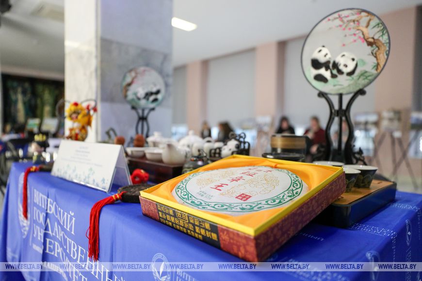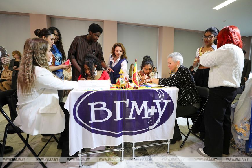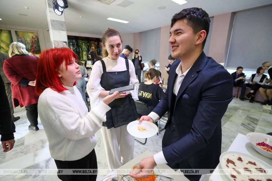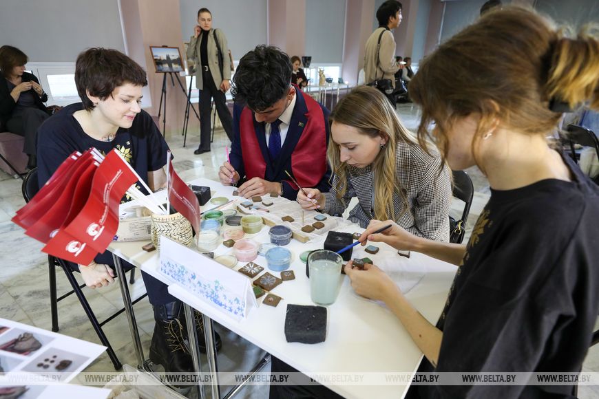 Наши студенты БГУКИ тоже подготовили для ребят-иностранцев ряд мастер-классов. Все вместе они делали специальные кубики из глины и разрисовывали их специальной краской. Стоило их совместить, как из мелких деталей получалась мозаика. Вместе с белорусами вырисовывал цветок василька студент из Средней Азии.