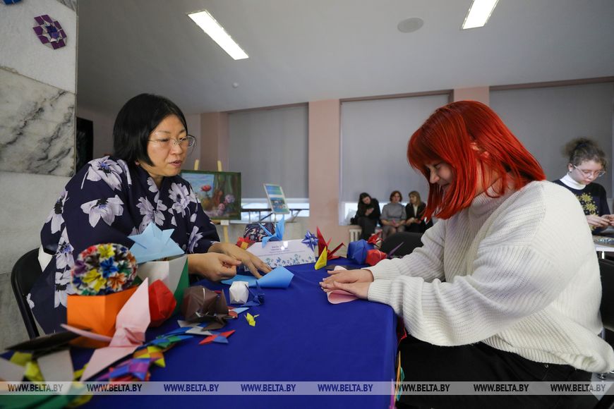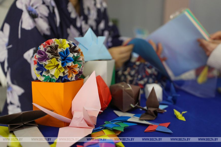 Познакомила с искусством оригами Нацуми Хориути. Девушка хорошо говорит по-русски и подсказывала, как повернуть уголочек бумаги, сделать правильный загиб, грамотно подобрать оттенок бумаги. Особенность оригами - практически для любой фигурки не нужны дополнительные инструменты. Только для изготовления шара понадобится скотч. Нам предложили два варианта: классического журавлика и шлем. Выбрали последний и приступили.
