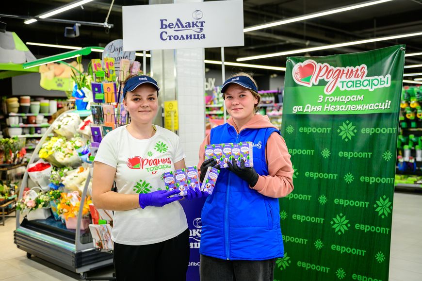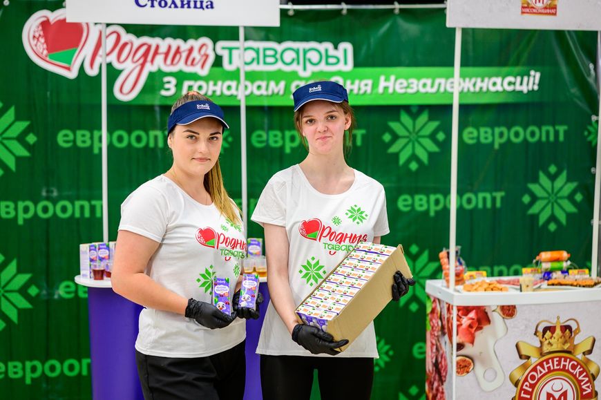В акции принимают участие 8 известных белорусских предприятий и 25 магазинов "Евроопт". Все дегустационные зоны, от баннеров и стоек до одежды промоутеров, оформлены в едином стиле с узнаваемым слоганом: "Родныя тавары - з гонарам да Дня Незалежнасцi".