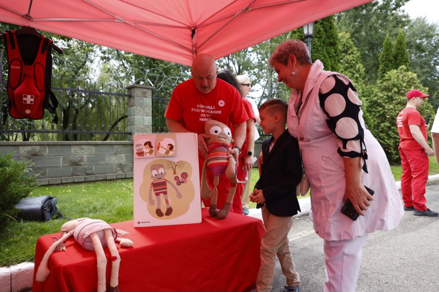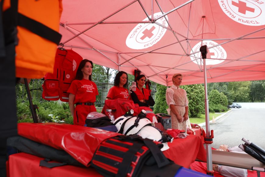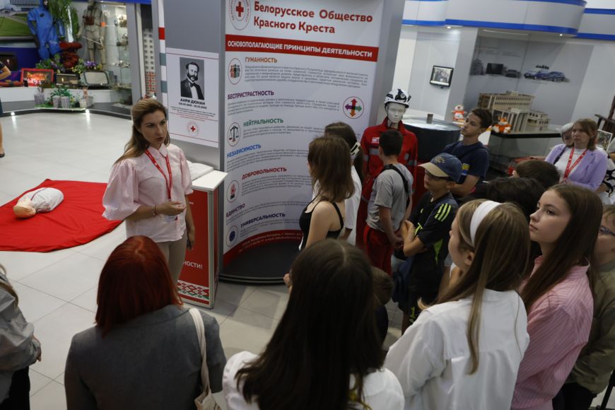 Перед началом увлекательного урока председатель Минской городской организации БКК Романия Зорина озвучила план: "В преддверии первого сентября Красный Крест проводит массу гуманитарных мероприятий. Одно из них необычное. В частности, вместе с городским управлением МЧС в Музее огня открыли экспозицию, которая посвящена обучению навыкам первой помощи. Будем рассказывать о том, как работает наша команда реагирования на чрезвычайные ситуации, покажем, как она действует".