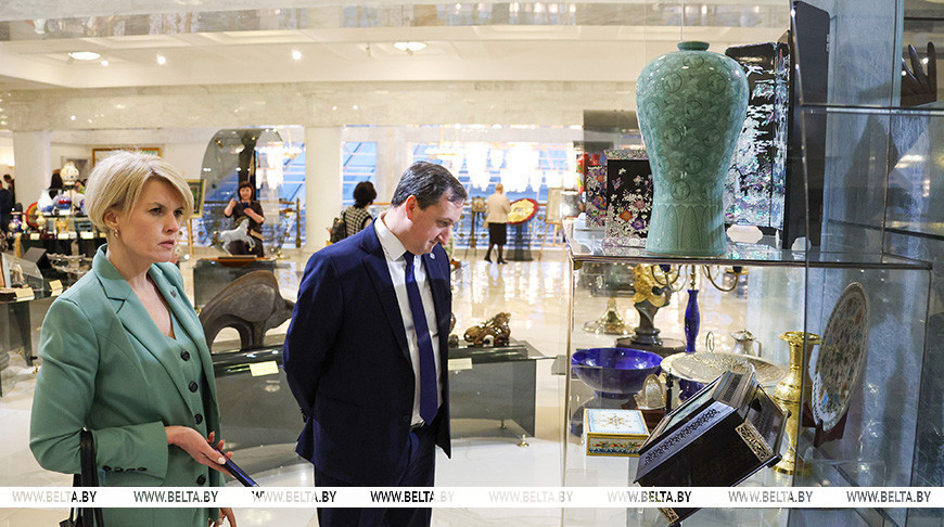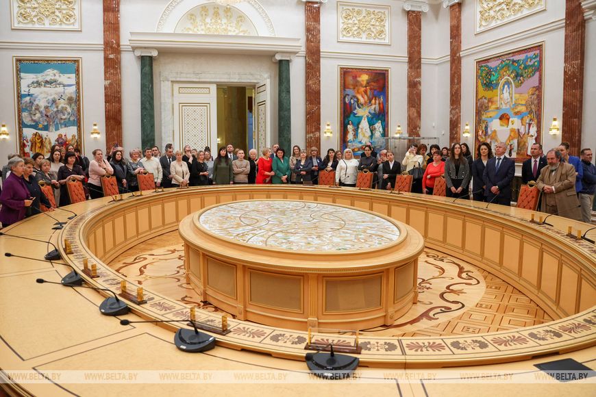 "Очень нравится сочетание цветов, масштаб и убранство этого зала. Я обратила внимание на выставку караваев, слуцкий пояс, картины... Все выглядит очень органично, ничего лишнего нет", - поделилась впечатлениями директор Полоцкого филиала БелТПП Анна Филипчик.Маршрут продолжился в Зеленом зале, который в 2015 году стал известен во всем мире. Именно здесь в феврале прошли переговоры "нормандской четверки" - 17-часовой переговорный марафон, итогом которого стало подписание Минских соглашений. Это был серьезный шаг на пути к миру на востоке Украины. Оказаться в таком, без преувеличения, историческом зале - дорогого стоит.
