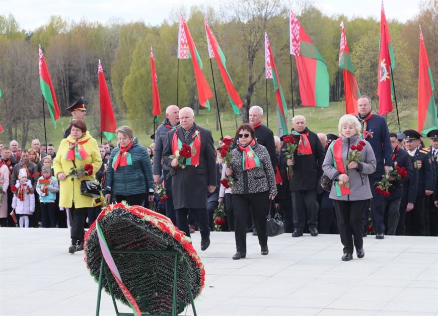 Собравшиеся возложили цветы к монументу "Непокоренный человек", минутой молчания почтили память жертв Великой Отечественной войны. В эти минуты Архиерейский хор минского Свято-Духова кафедрального собора исполнил произведение "Вечная память".