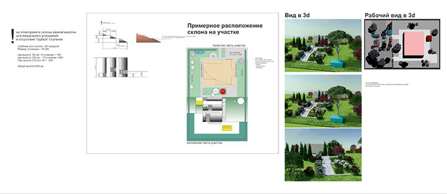 Многие жители Беларуси не могут уделять много времени дачной растительности, поэтому мы придаем особое значение композициям из насаждений, не требующих ухода, с учетом местных климатических условий. На каждом участке создается свой микроклимат. Среди уникальных его условий – склон участка, освещенность (направление юг-север), тип грунта (суглинок, глина, песок, торф). Все эти особенности необходимо учитывать при проектировании. Например, самым удобным углом склона является 26є. На сайте подробно описано, как самостоятельно измерить угол склона ( http://landscape.alina-design.com/height ) и определить тип почвы ( http://landscape.alina-design.com/land/)
