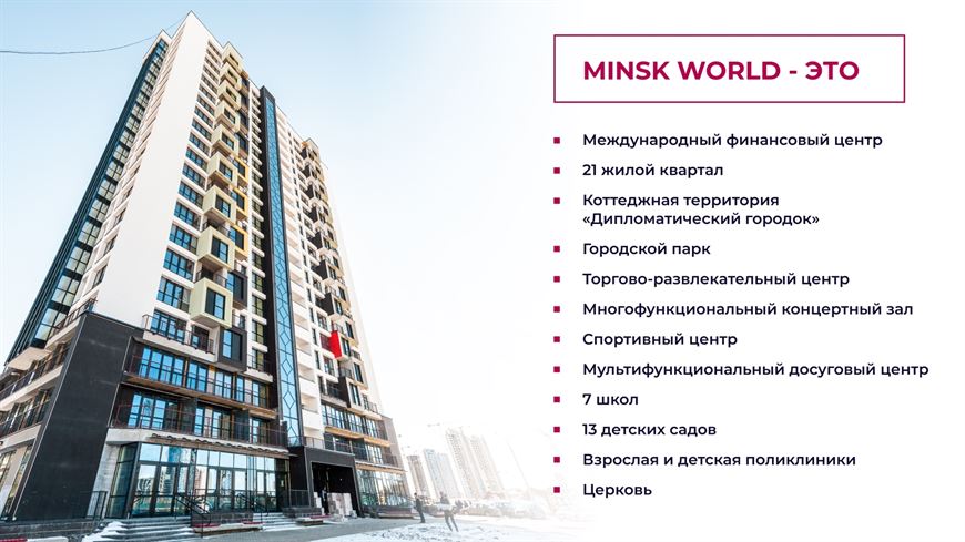 Покупая квартиры в многофункциональном комплексе Minsk World, вы получаете не просто квадратные метры. Это и прибыльные инвестиции, и точка для успешного бизнеса любого направления, и место для отдыха и комфортной жизни.