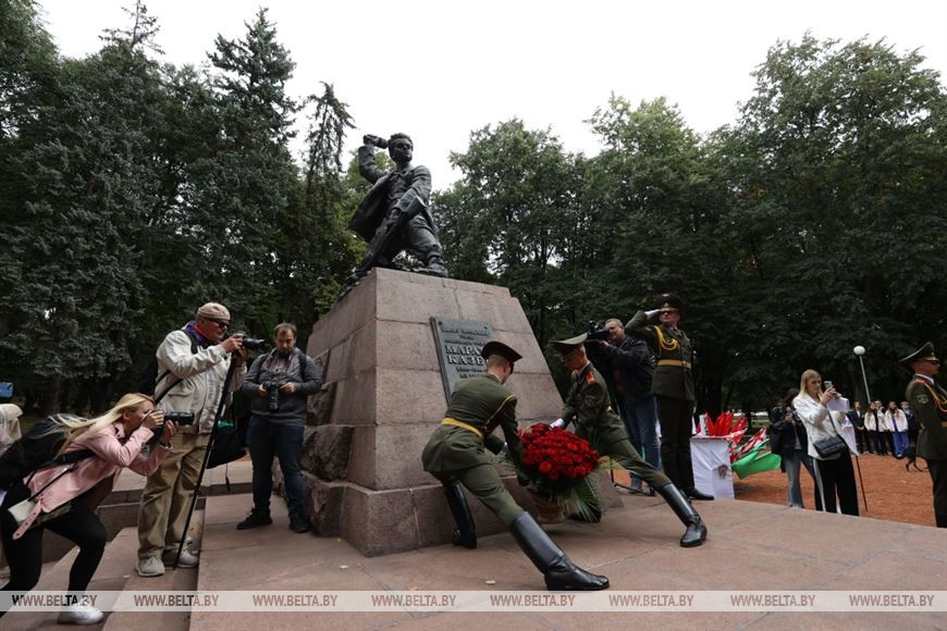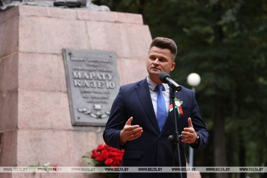 "Прежде всего хочется всех поздравить с очень важной и знаковой датой: завтра мы отметим 20-летие Белорусского республиканского союза молодежи. Но история комсомола гораздо шире. И сегодня мы неслучайно выбрали именно это памятное место - у памятника пионеру-герою Марату Казею. Это именитый уроженец нашей страны, который в годы Великой Отечественной войны показал, каким должен быть патриот, как он должен относиться к родной стране и что он может сделать в тот момент, когда перед ним встает выбор: остаться преданным своей Родине, остаться гордостью для своих родных и близких, для своей земли или быть предателем. Марат Казей тогда сделал свой выбор: подорвал себя и тех фашистов, которые его окружили. Это очень эмоциональная история, но она символизирует то, что ментально заложено в наших людях и чем мы сегодня с вами гордимся. Возлагая цветы, мы отдаем дань памяти и почести нашему национальному герою", - сказал Александр Лукьянов.