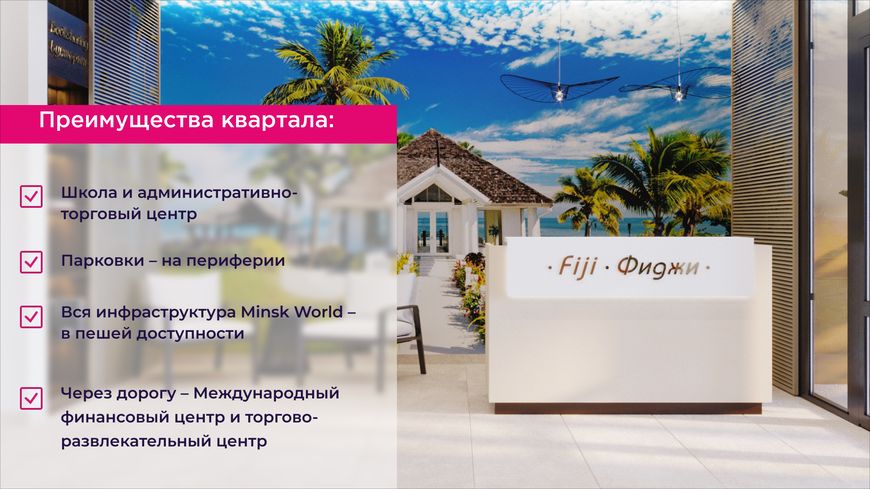 В одноименном доме многофункционального комплекса Minsk World купить недвижимость так же легко, как и на южных просторах Тихого океана. Застройщик предлагает рассрочку на 100 месяцев, а первоначальный взнос – всего 10% от всей суммы! Дом планируется сдать в первом квартале 2023 года.