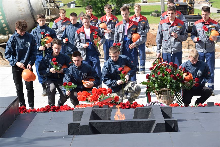 Перед началом трудовой акции молодежь Союзного государства почтила память жертв Хатыни минутой молчания и возложила цветы и зажженные лампады к мемориалу "Вечный огонь".