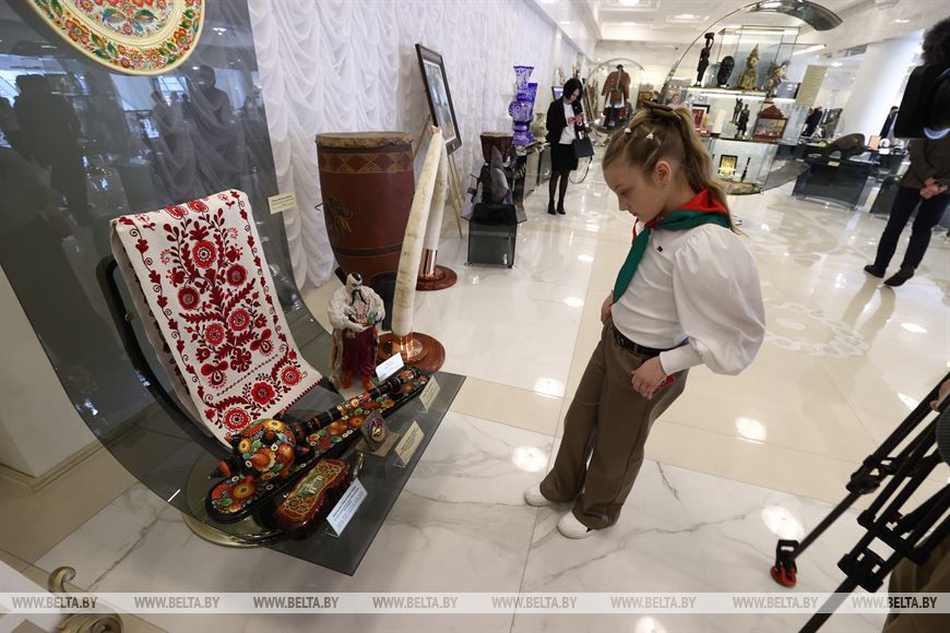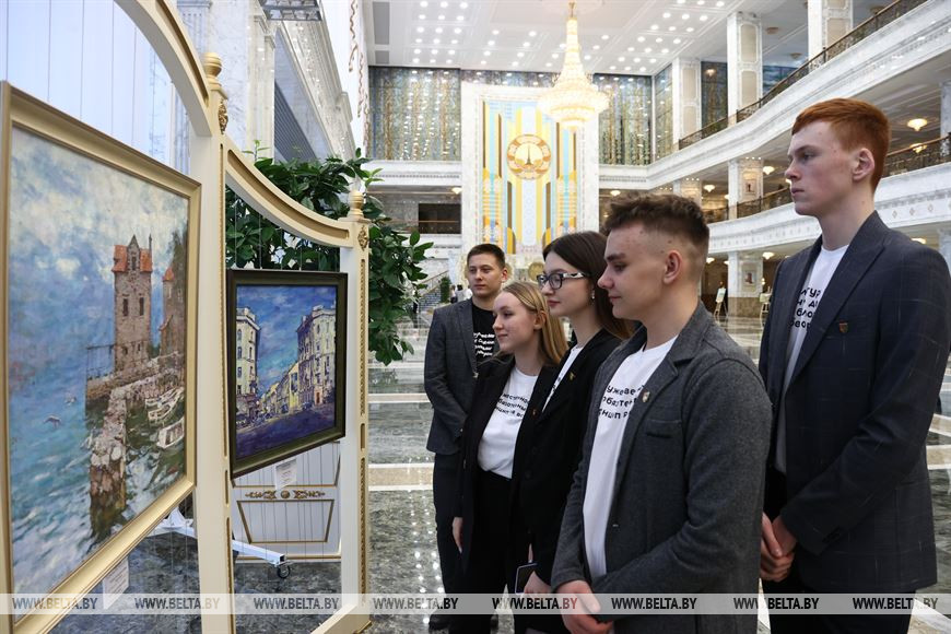 К экскурсии присоединились художник Михаил Крот и работники галереи "АртХаос". Как сообщалось БЕЛТА, с 8 февраля во Дворце Независимости экспонируется выставка пейзажей художника под названием "УМираТворение".