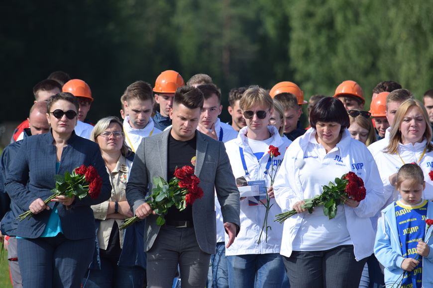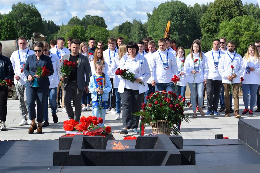 Перед началом трудовой акции молодежь Союзного государства почтила память жертв Хатыни минутой молчания и возложила цветы и зажженные лампады к мемориалу "Вечный огонь".