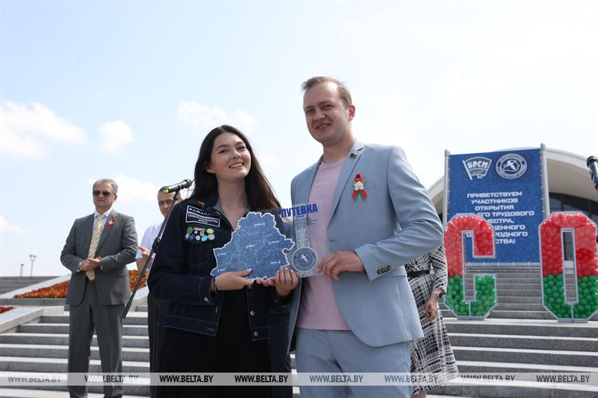 Центральным событием республиканского открытия третьего трудового семестра стала торжественная церемония вручения трудовых путевок командирам отрядов областных и республиканских трудовых проектов для работы на различных объектах страны. К слову, трудовые путевки вручены сводному студенческому отряду трудового проекта "Всебелорусская молодежная стройка "Город молодости" (строительство инфраструктуры Островца, работа на строительных объектах БелАЭС) и сводному студенческому отряду молодежного производственного проекта "Атлант-2021", бойцы которых с начала новой недели приступят к работе в местах дислокации.