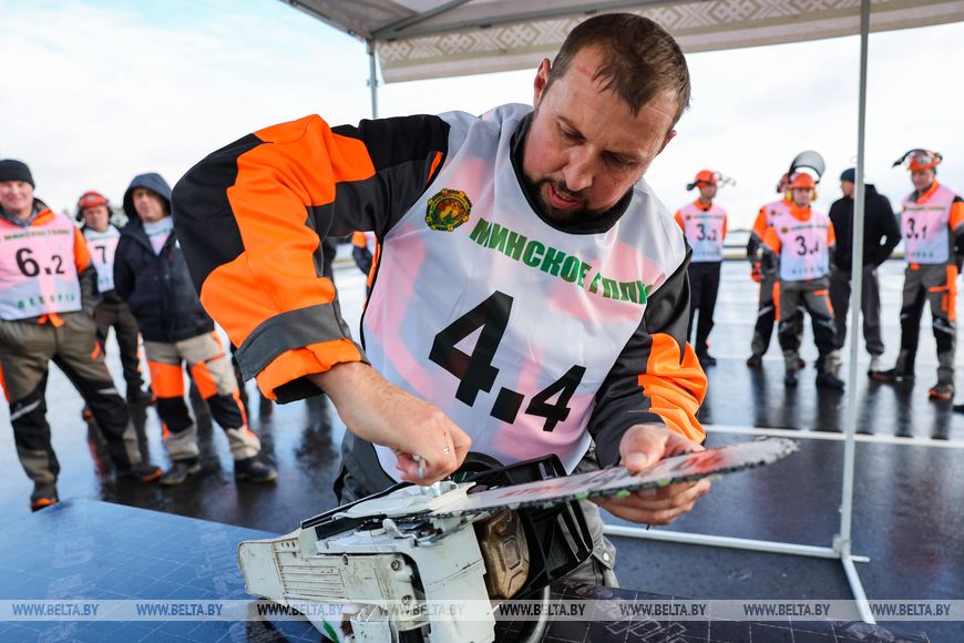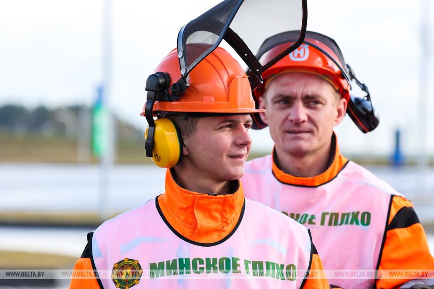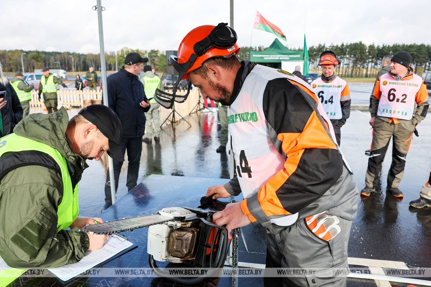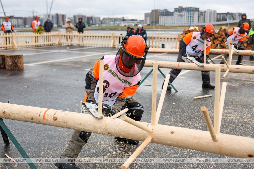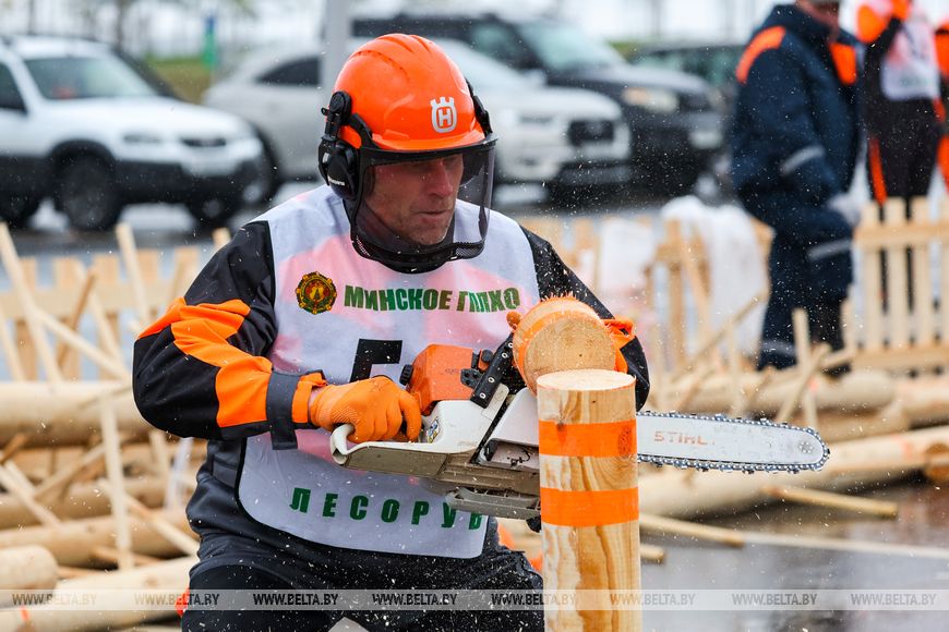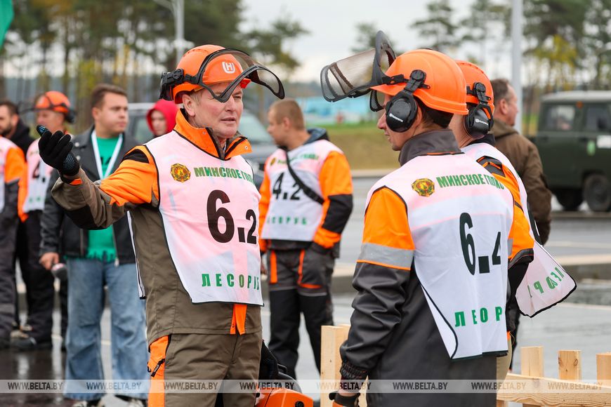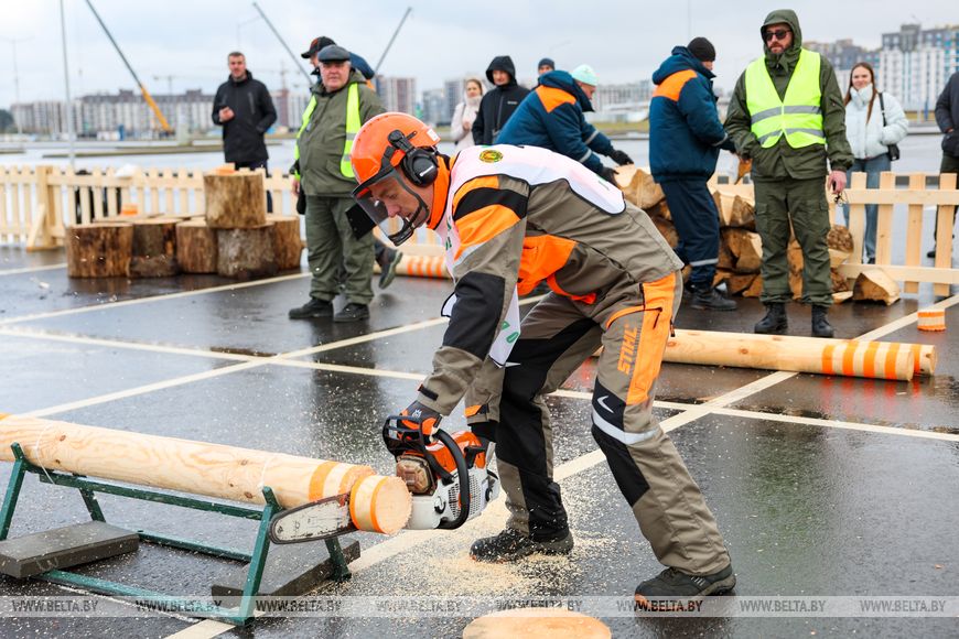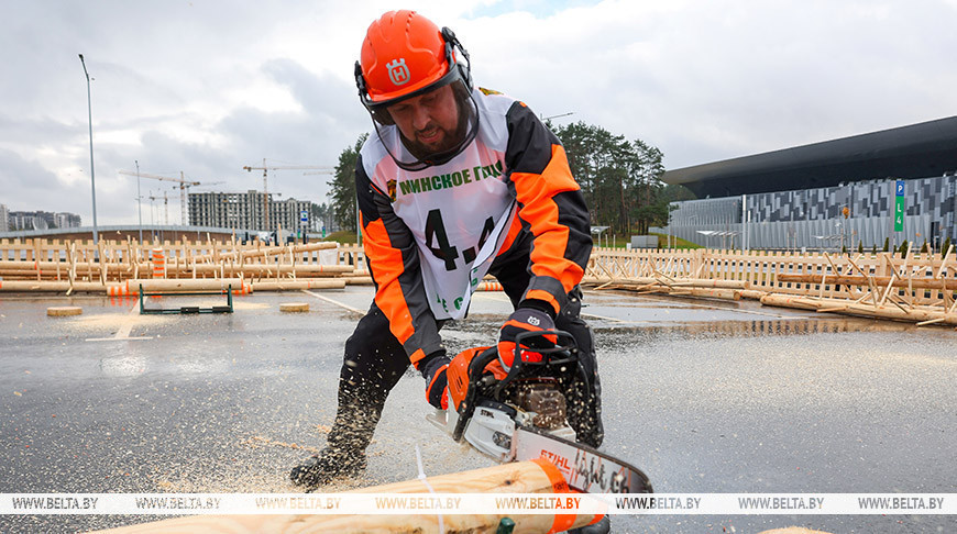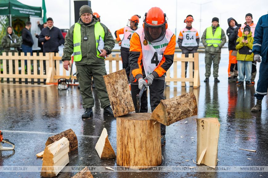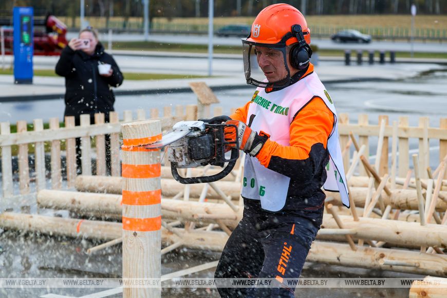 17 октября, Минск /Корр. БЕЛТА/. XXI Международная специализированная выставка-ярмарка "Лесдревтех" проходит в Минске. 17 октября в рамках мероприятия состоялись соревнования вальщиков леса, в которых приняли участие шесть команд. Участники выполняли вертикальное и горизонтальное пиление, обрезку сучьев, а также перерубали бревна топором. Главными критериями при оценивании работ стали точность, скорость выполнения задачи и соблюдение мер безопасности.-0-