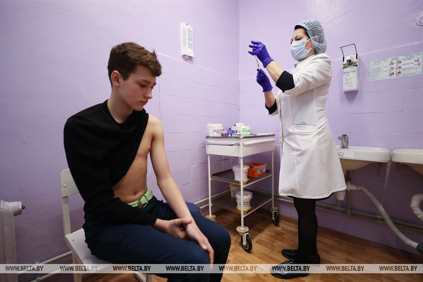 В первую волну подростки практически не болели COVID-19. Однако сейчас это происходит все чаще. Бывают случаи, когда болезнь протекает не бессимптомно. Это доказывает - вакцинация нужна не только взрослым. В УЗ "Солигорская ЦРБ" делать детям прививки от коронавируса начали, как только Минздрав Беларуси разрешил их вакцинацию. По словам главного врача Александра Киселя, во время зимних каникул подростков прививали в поликлинике. С началом новой четверти в школы и колледжи отправились выездные бригады медиков.