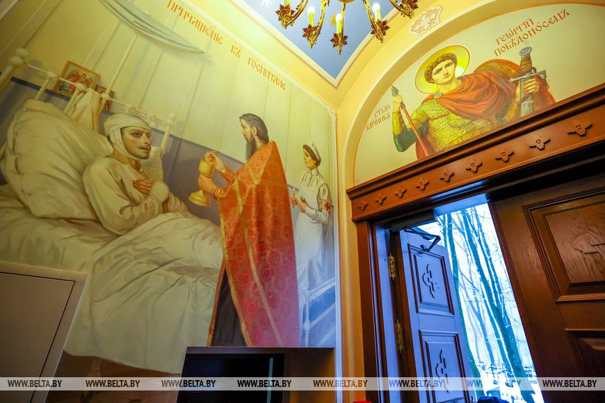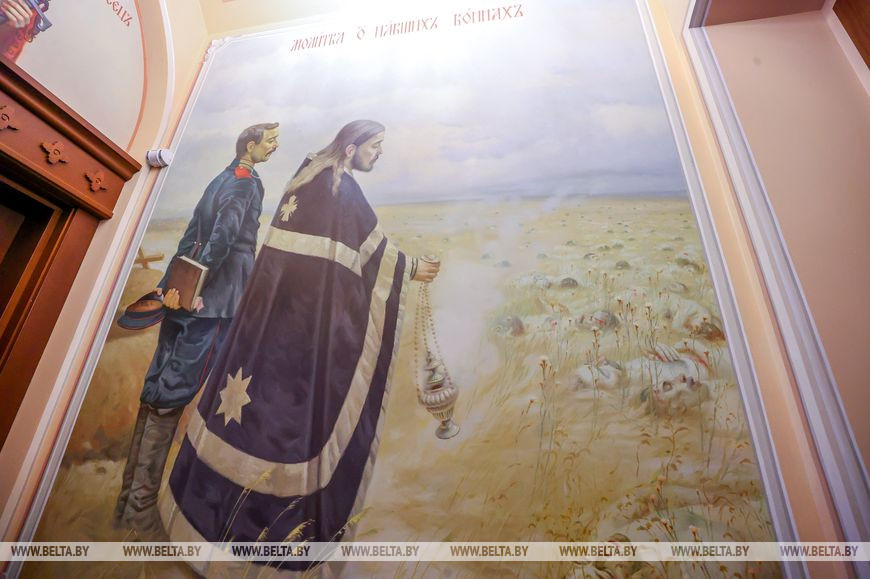Сюжетом второго изображения в притворе, которое находится с противоположной стороны, также стали реальные события. Первый настоятель и строитель Александро-Невской церкви священник Павел Богданович причащает воинов. Именно он, полковой священник, совершал богослужения и таинства в церкви равноапостольной княгини Ольги в Минском военном лазарете.