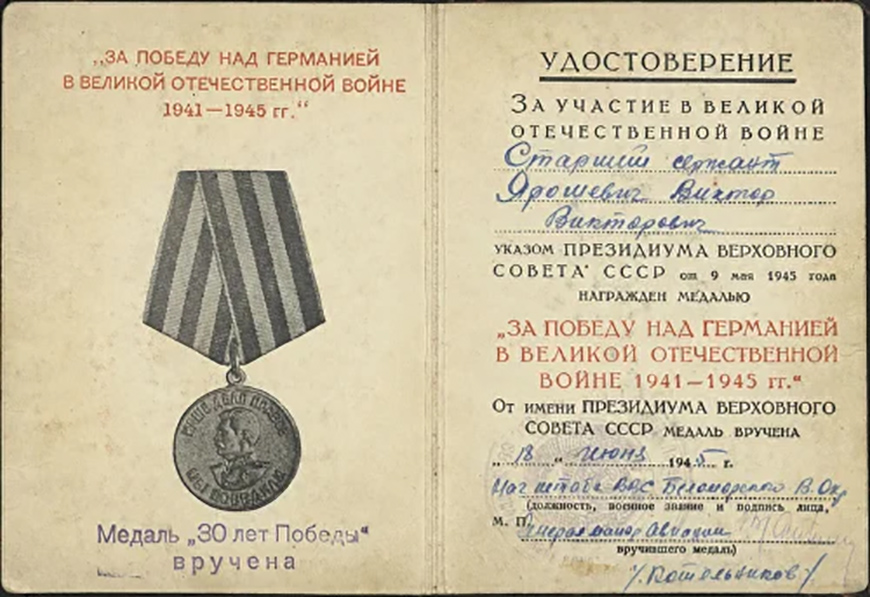 Командир башни, затем механик-водитель танка старший сержант Ярошевич получил благодарности Сталина за отличные боевые действия по освобождению города Петсамо (Печенги), района никелевого производства, города Киркенес и Печенгской области. В июле 1944 года он был награжден орденом Отечественной войны 2-й степени и медалью "За отвагу", в 1945-м - медалью "За оборону Советского Заполярья". Проект "Парад Победителей: истории и лица" выходит в газете "7 дней" и на сайте БЕЛТА. На протяжении целого года мы рассказываем о белорусах, принимавших участие в первом в истории СССР Параде Победы. Эти люди воевали подо Ржевом и Одессой, выиграли Сталинградскую и Курскую битвы, освобождали Беларусь, взяли Берлин. А 24 июня 1945 года триумфальным маршем прошествовали по Красной площади в Москве. Они - лица нашей самой Великой Победы!-0-