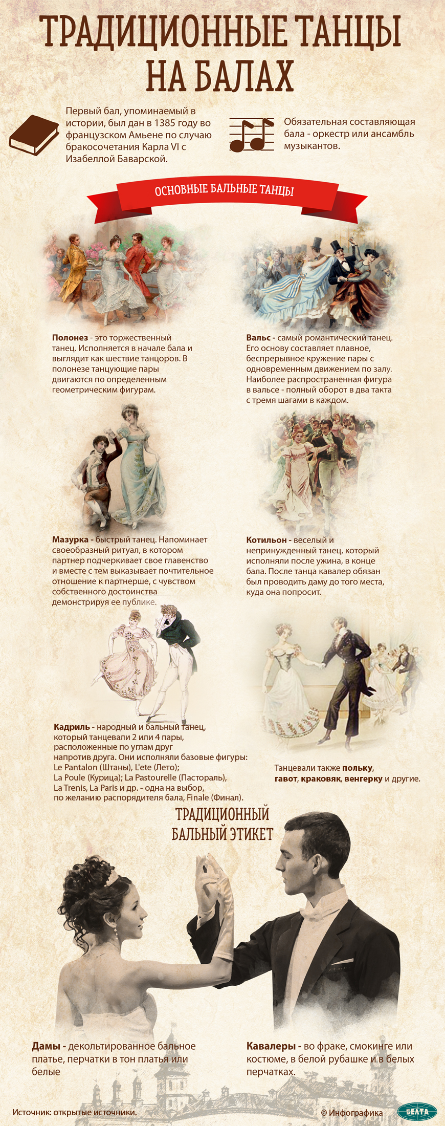Девушки в пышных белоснежных платьях в пол в сопровождении молодых людей во фраках и военных мундирах заполнили зал и, едва справляясь с волнением и эмоциями, исполнили свой первый бальный танец - величественный полонез. Так открылась первая, классическая часть бала.