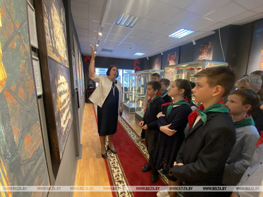 Частью памятного урока для учащихся 61-й школы стала экскурсия в музей геноцида белорусского народа, который открылся в учреждении прошлым летом к новому учебному году. "После опубликования материалов Генпрокуратуры Беларуси о геноциде белорусского народа мы создали музейную композицию, посвященную этой тематике. Для этого было выбрано и специально оформлено отдельное помещение. Мы хотели оттолкнуться от фотоматериалов, но, когда начали работу над музеем, поняли, что необходимо создать композицию, которая потрясла бы воображение детей, не пугая их. Тогда мы пришли к изобразительному искусству. Наша пионерская дружина носит имя Михаила Савицкого, с его картинами мы давно работаем. Часть его творчества посвящена концентрационным лагерям, она реально потрясает воображение. Здесь есть материалы о Тростенце, о холокосте, о лагерях военнопленных, детских лагерях, лагере Озаричи. Все материалы поданы в таком формате, чтобы будоражить сознание детей, но не пугать их. Мы стремились поставить во главу угла не только знания детей об истории, но и их чувства. Потому что чувство сострадания, понимания тех переживаний, которые выпали на долю нашего народа, должно обязательно идти наравне со знаниями. Кто-то из великих сказал, что нравственность ребенку прививается матерью как чувство, так же школа должна прививать детям патриотизм как чувство через личное осознание тех трагических уроков истории, которые когда-либо выпадали на судьбы нашего народа, а значит, наших предков", - подчеркнула Ирина Цубикова.