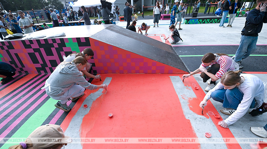 Не расстроились и ребята. Маленькая жительница Постав Алиса Юркова поделилась, что пришла участвовать в мастер-классе с друзьями. Они ждали, когда фестиваль приедет в их город, так что даже предупреждение о дожде их не остановило. "Круто, что можно приложить руку к тому, что будет украшать город. У меня есть самокат и ролики, так что я буду приходить сюда кататься и радостно вспоминать, как сама украшала площадку", - рассказала она.