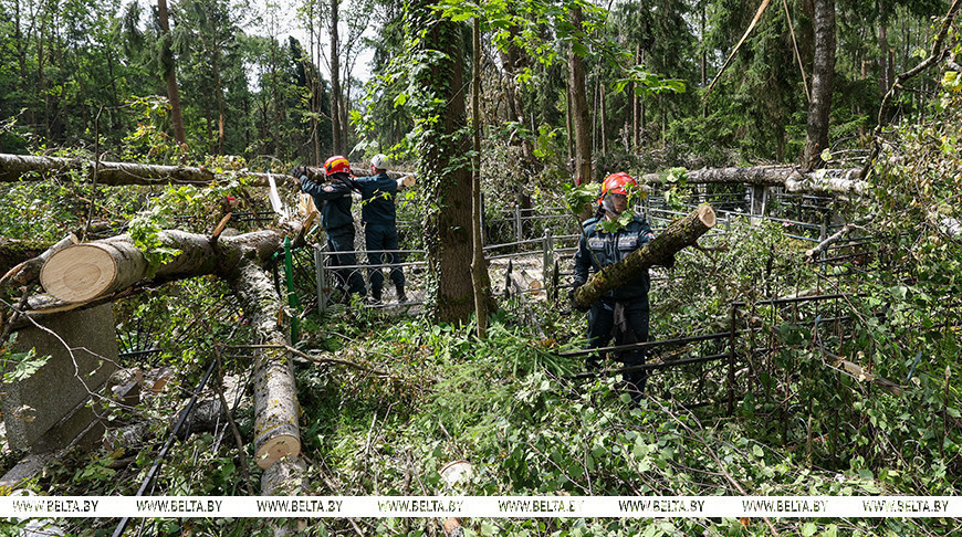 последним тоже досталось.Курсант 2-го курса Университета гражданской защиты МЧС Илья Минчук родом из Могилева. "Я поехал учиться в Минск, а вот теперь пришлось вернуться в родной город помогать людям. Моя группа работает со вторника - носим бревна, ветки убираем. Бабушки подходят, просят помочь - в основном просят приподнять ограду, выровнять памятники. Мы это и сами делаем, упавшее поднимаем, кривое ровняем. Стараемся как можно больше помочь", - поделился курсант.-0-
