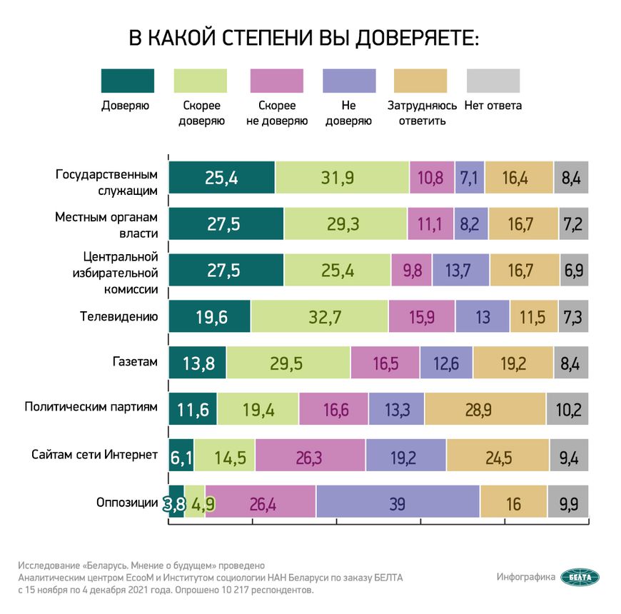 В рамках социологического обеспечения республиканского референдума с 15 ноября по 4 декабря 2021 года социологический консорциум ГНУ "Институт социологии НАН Беларуси" совместно с Аналитическим центром EcooM провел масштабное социологическое исследование "Беларусь. Мнение о будущем". В опросе приняли участие 10 217 респондентов.