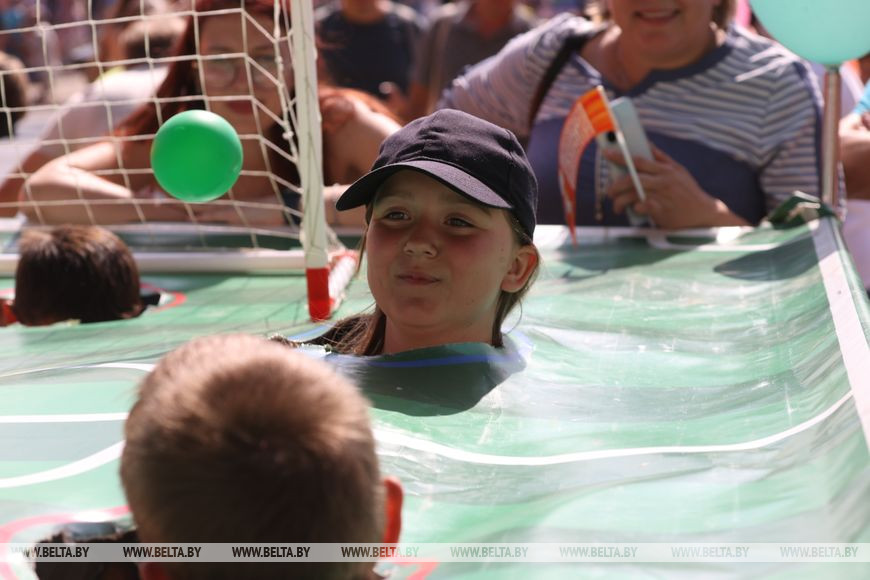 Третий год подряд в "Вытоках" участвует самый спортивный банк страны - Белагропромбанк. Сегодня сотрудники банка обустроили для будущих чемпионов пять спортивных локаций. Особенно полюбились они участникам испытания по сумо и перевернутому футболу. Помогает создавать праздничное настроение любимец публики Агрик.