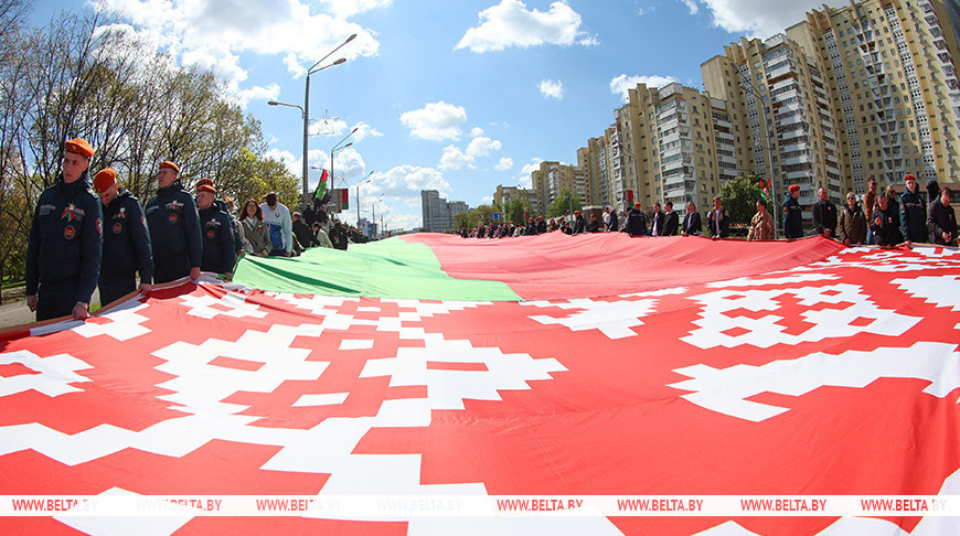Она отметила, что символы нашего государства как раз и олицетворяет этот мирный уклад жизни и благополучие. "Это все символизируют золотые колосья, цветы льна, клевер, земной шар, который означает наше дружелюбно отношение ко всем", - подчеркнула артистка.Сегодня Государственный флаг по проспекту Победителей до площади Государственного флага пронесли одновременно более 700 человек. Полотнище флага впечатляет - 500 м длиной и 9 м шириной. Вес - более 400 кг.