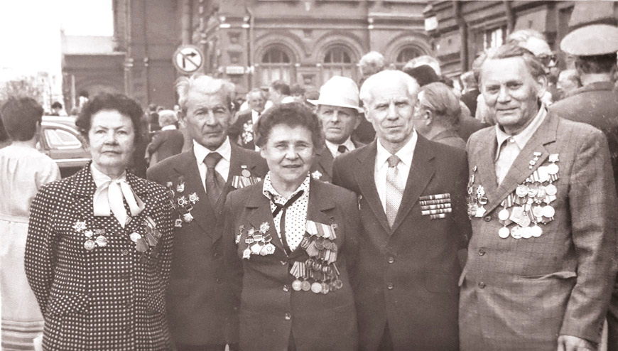 1988 год. Встреча ветеранов 873-го полка в Москве: Василий Тимофеевич - второй слева, Фаина Аббасовна - в центреЖенщина добавляет: эти двое были из одного теста. Орденоносцы. Беззаветно любящие Родину. Отчаянно смелые. В наградных листах Фаины Аббасовны часто встречается словосочетание "презирая смерть". Презирая смерть, вытаскивала раненых с поля боя, тушила загоревшийся БМП, под шквальным огнем ползла по крутому склону с 80-килограммовым ящиком снарядов.