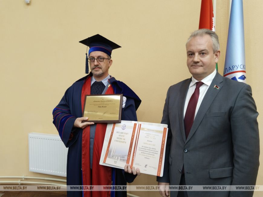 "Мы открыты для взаимодействия, наше международное сотрудничество выходит на новый уровень", - сказал он.По словам проректора по международным связям БГМУ доктора медицинских наук, профессора Василия Руденка, звание "Почетный доктор" БГМУ было единогласно присуждено профессору еще в октябре прошлого года, но только сейчас ему удалось приехать в Беларусь.