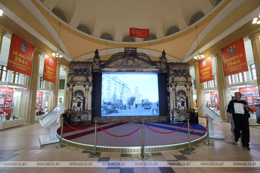 К 3 июля в павильоне открылась выставочная экспозиция "80 лет Победы в Великой Отечественной войне". Прямо на входе на большом экране посетителей знакомят с архивной хроникой военных лет. А сам экран помещен в макет здания Рейхстага в Берлине с поднятым над его куполом красным знаменем.