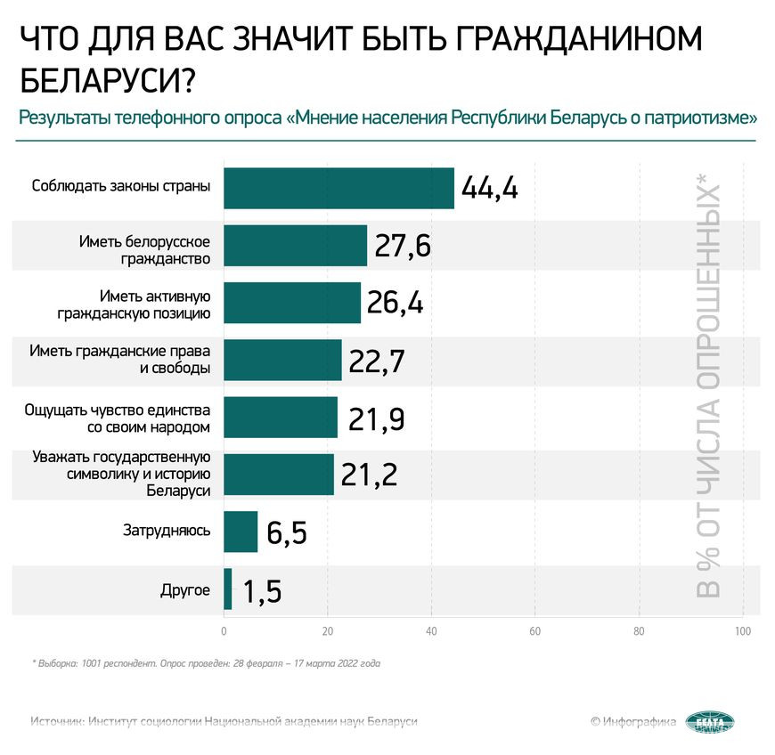 На вопрос, что такое быть гражданином Беларуси, респонденты отвечали, что это значит соблюдать законы страны, иметь белорусское гражданство и занимать активную гражданскую позицию. "Среди молодежи 51,1% сказали, что быть гражданином - это жить по законам страны. Среди тех, кто старше, удельный вес таких людей несколько меньше. Мы также задали прямой вопрос, считают ли себя патриотами наши граждане. Мы знаем, что в республике реализуется программа патриотического воспитания населения, существенно обновилось законодательство. Огромная работа проводится целым рядом министерств и ведомств. Патриотами себя считают 55,9% респондентов, скорее считают - 30,6%. В общей сумме получается 86,5%. В среде молодежи этот процент равняется 85%", - прокомментировал результаты исследования директор Института социологии НАН Беларуси.