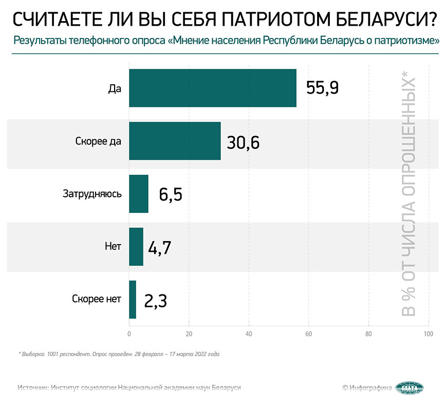 "Мы предлагали ответить, что есть Беларусь для наших соотечественников. Это не только страна, в которой мы родились и живем, но и та земля, на которой жили наши предки. Язык и культура Беларуси являются для нас родными. Это страна, с народом которой мы чувствуем тесную связь. Более 90% участников опроса гордятся тем, что являются гражданами Беларуси. Причем удельный вес тех, кто с гордостью называет себя гражданином, совершенно незначительно выше среди сельских жителей и составляет 95,8%. Почти 90% тех, кто проживает в городе, также гордятся своим белорусским гражданством. Если говорить о различных социально-демографических группах, то среди молодежи 96,9% гордятся тем, что являются гражданами нашей страны. Исследование было проведено с помощью республиканской результативной выборки, а также с соблюдением всех необходимых процедур, поэтому мы можем ему безусловно доверять", - подчеркнул Николай Мысливец.