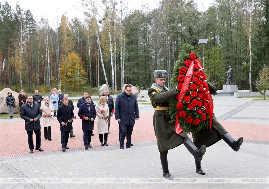 Первым пунктом программы стало посещение мемориального комплекса "Ола". Журналисты и идеологи прошли к мемориалу на месте сожженной нацистами в годы Великой Отечественной войны деревни Ола, повторившей судьбу Хатыни. Утром 14 января 1944 года немецкий карательный отряд вместе с войсковой частью окружил деревню. Фашисты зверски уничтожили людей: тогда погибли 1758 мирных жителей, в том числе 950 детей. Как дань уважения и почтения всех, кто погиб в годы Великой Отечественной войны, присутствовавшие возложили цветы и венки к монументу.
