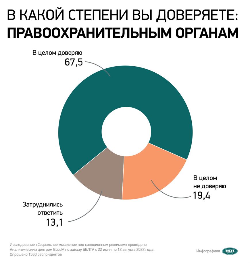 Социсследование также демонстрирует и рост доверия к правоохранительным органам. Так, в целом доверяют правоохранительным органам 67,5% белорусов, в целом не доверяют - 19,4%, затруднились ответить 13,1% респондентов.