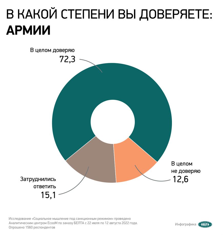 В период с 22 июля по 12 августа 2022 года по заказу БЕЛТА Аналитическим центром ЕсооM проведено социологическое исследование "Социальное мышление под санкционным режимом". Опрошено 1560 респондентов в населенных пунктах всех регионов Беларуси с соблюдением принципа репрезентативности для населения Беларуси от 18 лет по полу, возрасту, занятости, типу населенного пункта и региону проживания респондентов. Статистическая ошибка выборки не превышает 2,5%. Аналитический центр ЕсооМ аккредитован комиссией по опросам общественного мнения при Национальной академии наук Беларуси (свидетельство об аккредитации №000039 от 09.07.2020, продлено с 29.07.2022 года).-0-