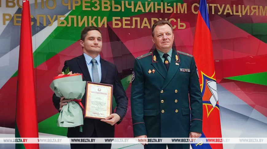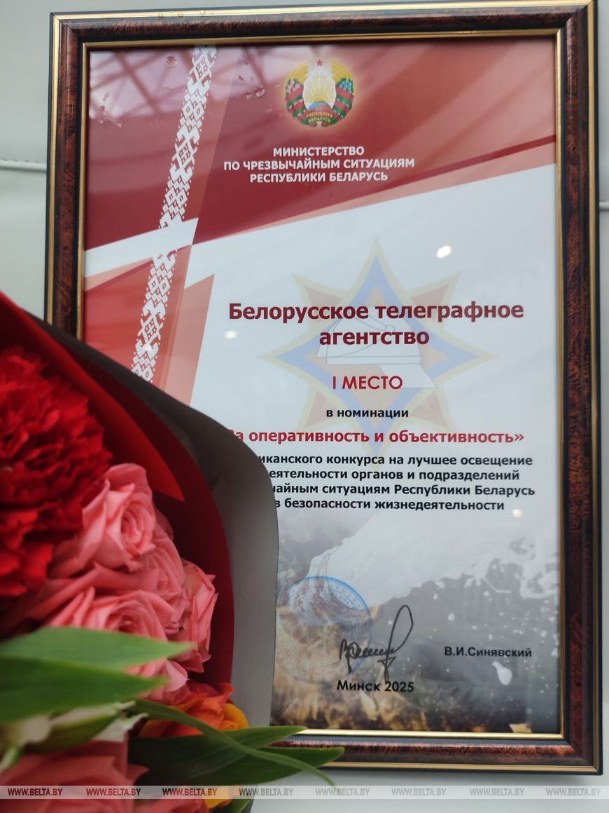 Сегодня в Республиканском центре безопасности жизнедеятельности МЧС в Минске прошла торжественная церемония награждения победителей Республиканского конкурса на лучшее освещение в СМИ деятельности органов по чрезвычайным ситуациям. Свои работы на конкурс отправили журналисты из разных уголков нашей страны. Белорусское телеграфное агентство стало победителем в номинации "За оперативность и объективность". Кроме того, благодарностью министра по чрезвычайным ситуациям был награжден корреспондент БЕЛТА Артем Апанович.