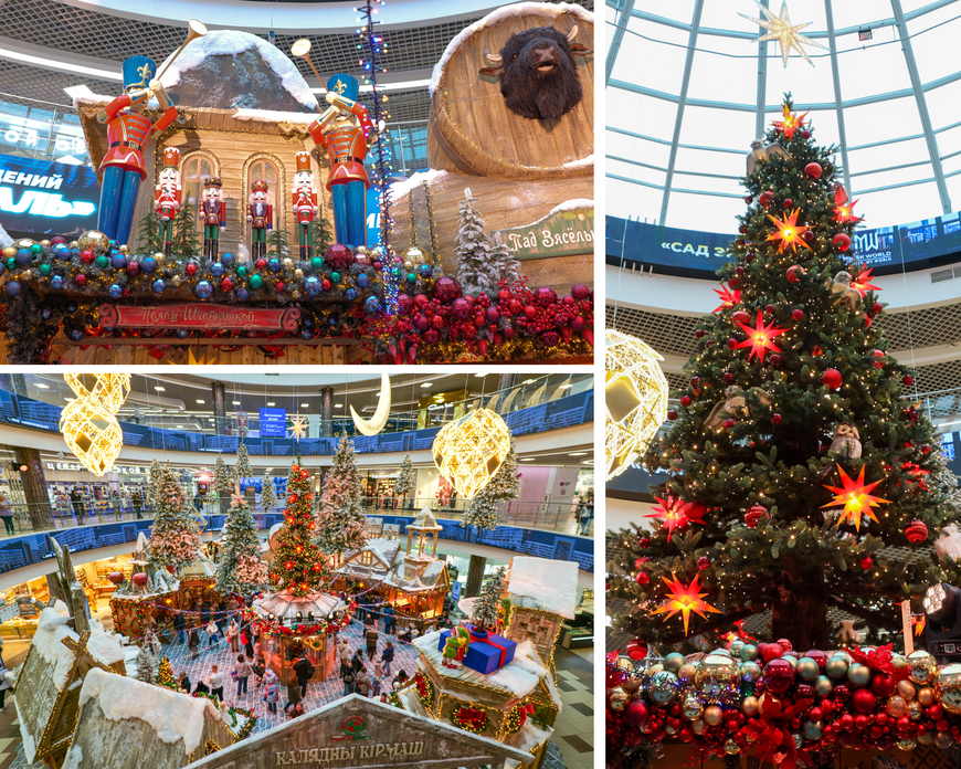 Именно здесь расположен крупный торговый центр Dana Mall - место выгодных покупок для всей семьи. Каждый год в декабре центр открывает впечатляющую новогоднюю инсталляцию и дарит своим посетителям ощущение праздника. В этом году здесь Калядны кiрмаш - сказочная ярмарка, наполненная деталями, звуками и символами белорусского Нового года.