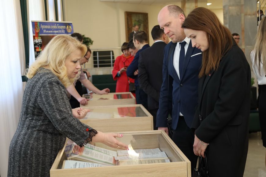 Мероприятие прошло в стенах актового зала Государственного комитета судебных экспертиз. В холле зала представители двух ведомств, а также учащиеся 10-х классов военно-патриотической (пограничной) направленности средней школы №206 им. А.М. Кижеватова Минска смогли познакомиться с экспозициями "О государственных символах Беларуси" и "Геральдика современной Беларуси", которые подготовил Национальный архив.