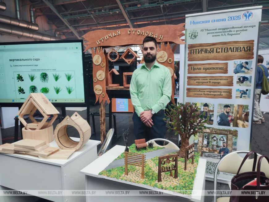 Мастер производственного обучения Минского государственного колледжа ремесленничества и дизайна имени Н. А. Кедышко Артем Григору представил проект "Птичья столовая". "Это экологические деревянные кормушки для птиц. Надеемся, что это поможет нам вернуть птиц в города, - пояснил автор проекта. - Планируем устанавливать их в жилых дворах, парках, скверах. Желающие увидят их и смогут присоединиться к инициативе - кормлению пернатых".